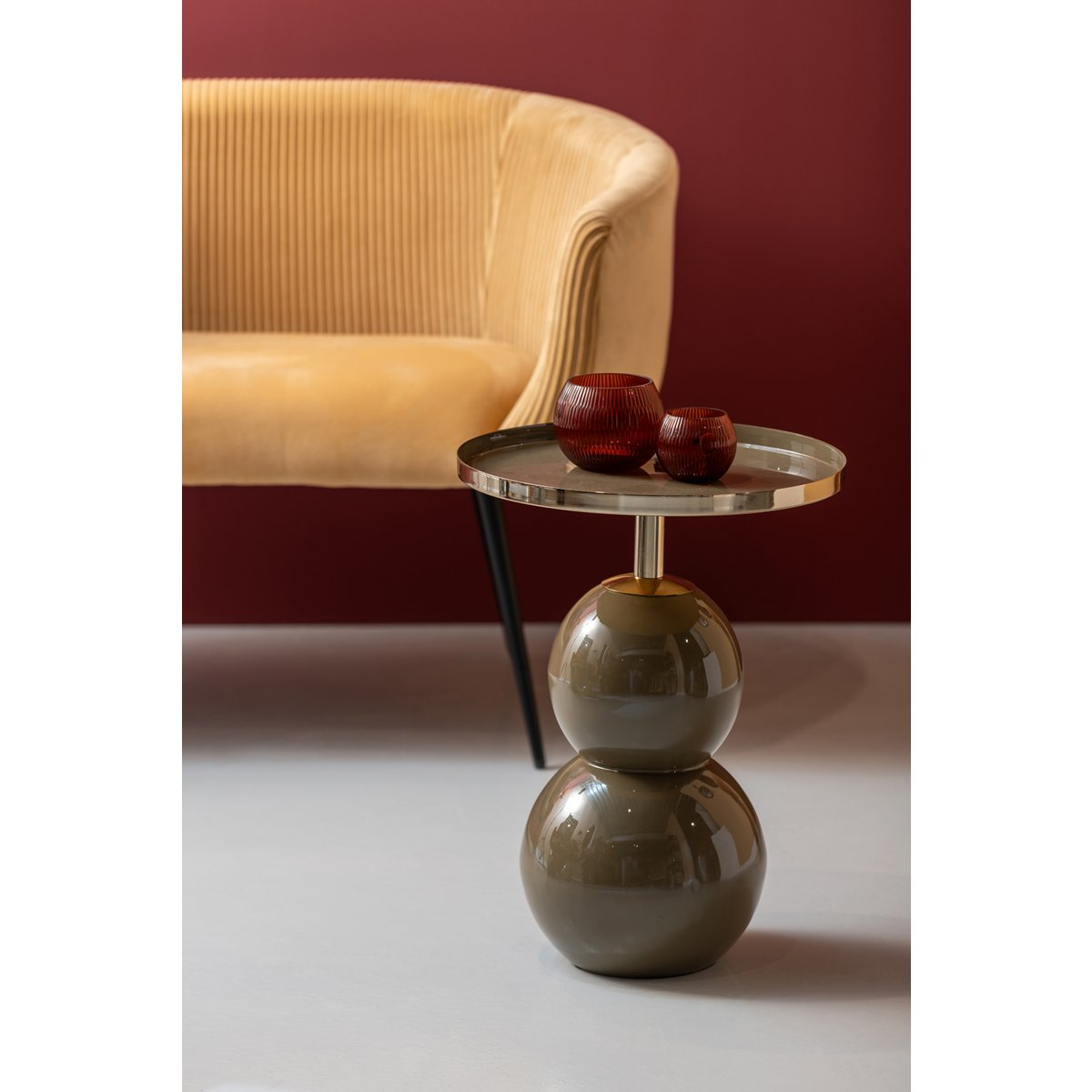 Haal opvallend design in huis met de Nora bijzettafel van Leitmotiv! De geëmailleerde glanzende afwerking in combinatie met de gouden accenten maken de Nora tot een ongetwijfeld chique smaakmaker. Plaats hem naast de bank voor je drankjes en snacks, of vul die lege plek in huis. Leuk te combineren met de andere bijzettafels uit de serie van Leitmotiv. De Nora is verkrijgbaar in mosgroen en warm grijs.