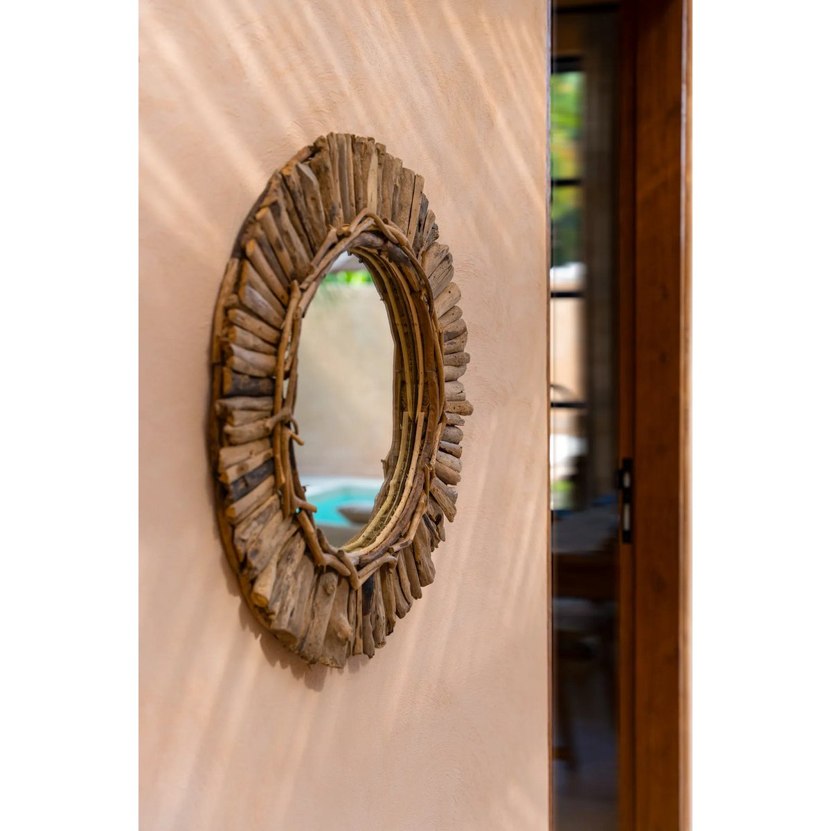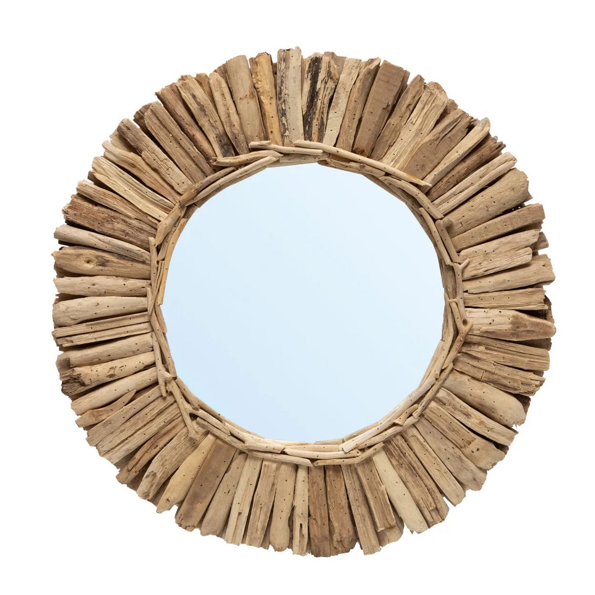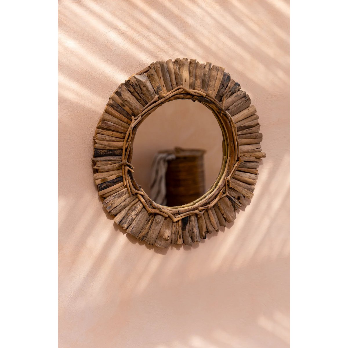 Deze prachtige spiegel is gemaakt door stukjes drijfhout te verzamelen en deze rond het ronde glas in het midden te plaatsen. Geen enkele spiegel is precies hetzelfde! Er zijn nog twee andere ontwerpen beschikbaar en door er meerdere te combineren, ontstaat een prachtige accentmuur. Breedte: 60cm Hoogte: 4cm Lengte: 60cm Gewicht: 1000g Materialen: Hout EAN/streepjescode: 7438246180164 SKU: JAHU037N-M-60