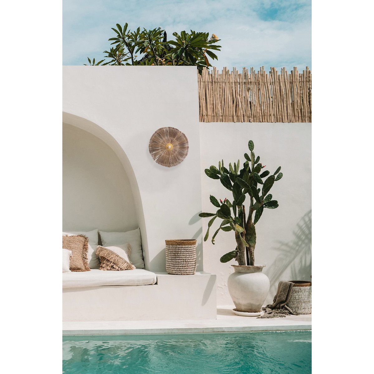 Deze Chi-Chi wandlamp van gras en ijzer is een prachtige aanvulling op elke blinde muur in je huis. De neutrale tinten zijn gemakkelijk te combineren met elk meubilair en decor, vooral dankzij de voelbare structuur van het gras. Het ronde, platte ontwerp zorgt voor veel lichtinval zonder het zicht te belemmeren. Perfect voor donkere gangen of overdekte buitenruimtes! Er zijn twee maten beschikbaar en ze passen geweldig bij elkaar...